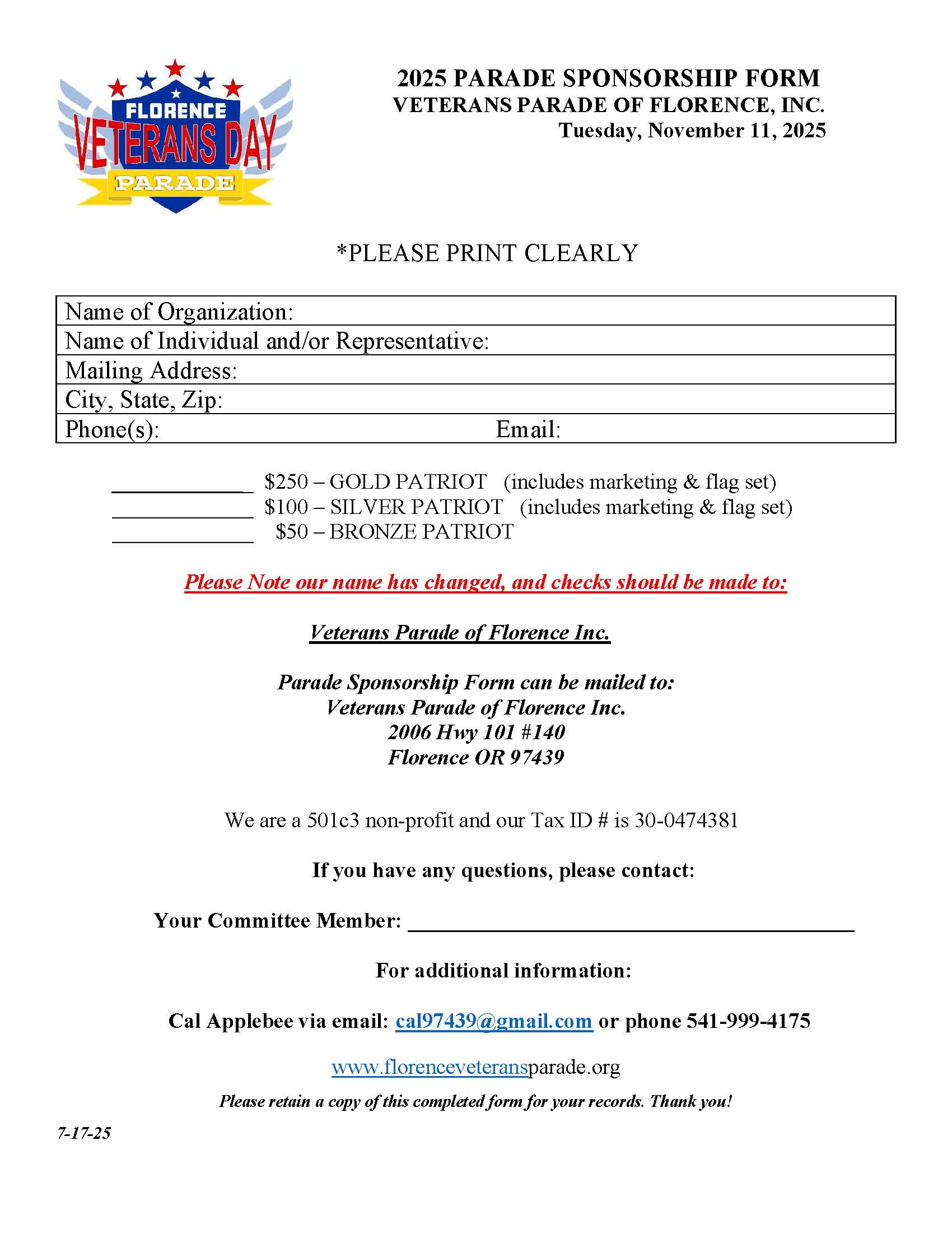 The Parade Sponsorship Form can be emailed to Cal Applebee at cal97439@gmail.com or mailed to